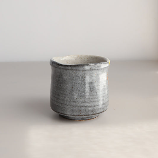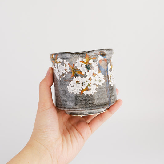 Kutani Ware Japanese Yunomi Tea Cup - Grey Yoshidaya Cherry Bird