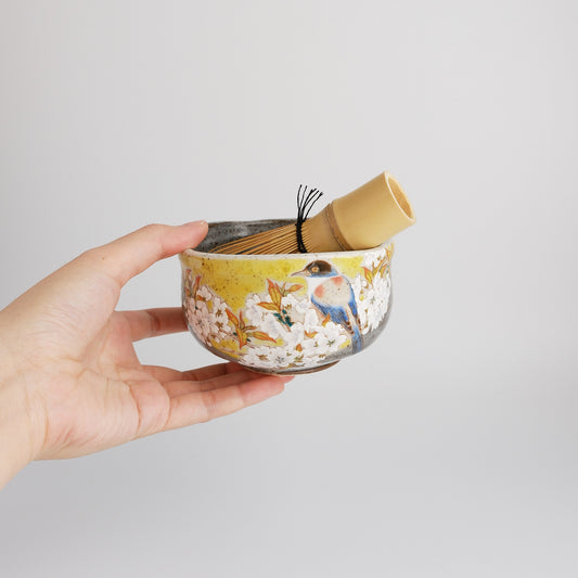 Kutani Ware Matcha Bowl - Yoshidaya Cherry Bird
