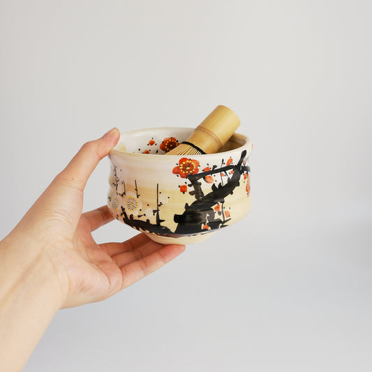 Kutani Ware Matcha Bowl - Red and White Plum Ume