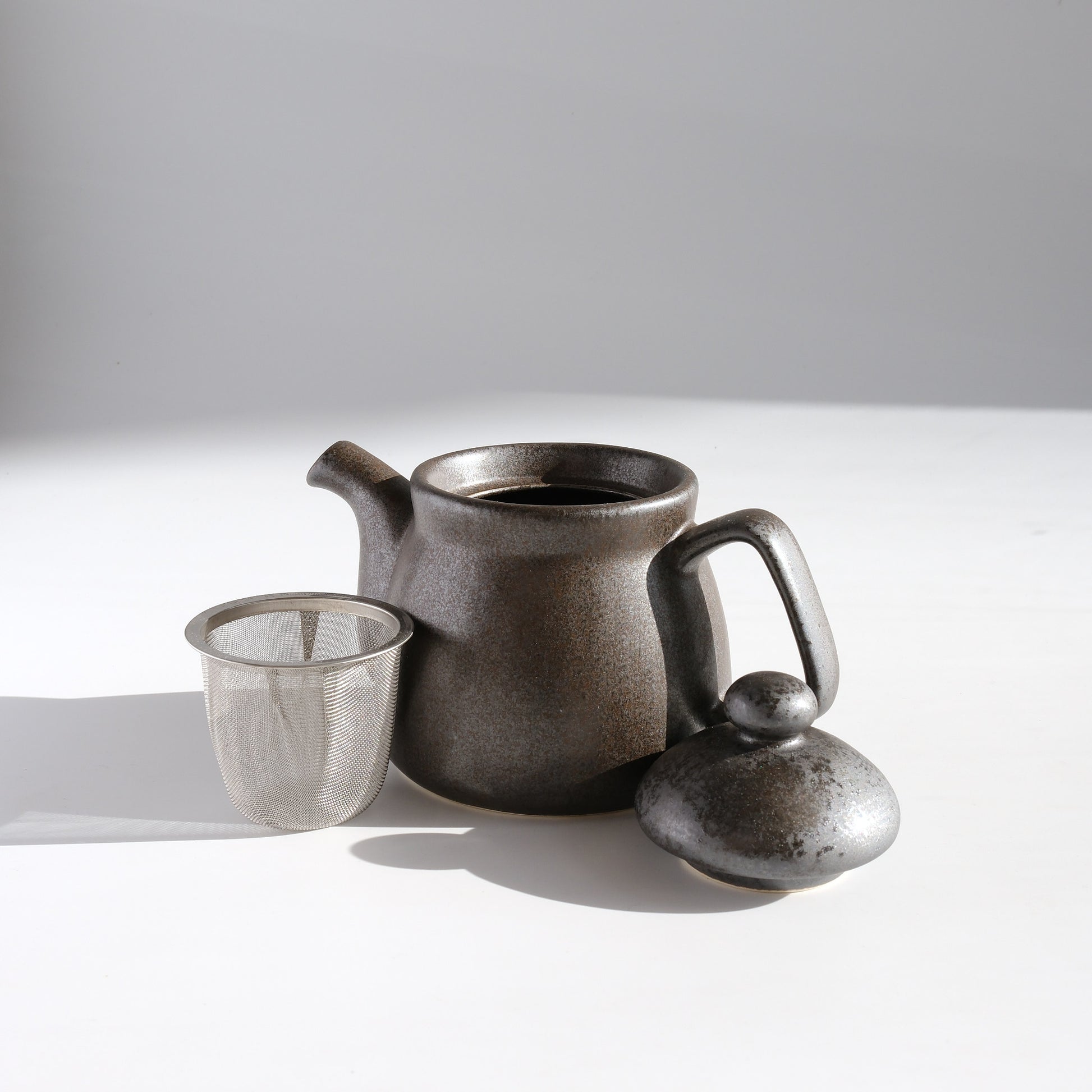 This Mino ware teapot features a matte greyish black glaze with a subtle cotton-cloth texture that gives it a soft, natural feel. The rounded body and curved spout ensure a smooth pour, while the wide handle provides a comfortable grip. A removable stainless steel strainer makes brewing and cleaning easy.